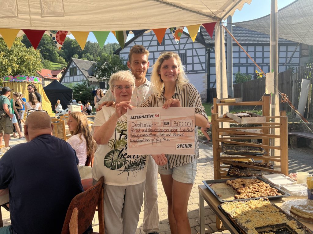 Am 16.08.2025 übergab das Team Haskala der Landtagsabgeordneten Katharina König-Preuss einen Spendenscheck der Alternative 54 e.V. in Höhe von 300€ an den Heimat- und Streuobstwiesenverein in Schloßkulm. Unterstützt wurde damit die Kulturveranstaltung „Brot und Blumen“, welche an diesem Tag als großes Dorffest mit Theater, Magieshow, Livemusik, großer Kuchentheke und vielen weiteren tollen Programmpunkten stattgefunden und viele Menschen in das 66-Seelen-Dorf gelockt hat.
